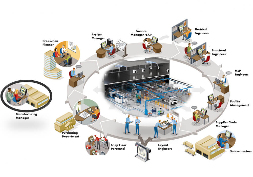 Bei der Planung von Fabriken und Fertigungsanlagen gibt es eine Vielzahl von Projektbeteiligten aus verschiedenen Gewerken des Maschinenbaus und dem Bauwesen, wie z.B. Hochbau, Infrastruktur, Gebäudeausrüstung (TGA), Layoutplanung, technische Anlagen, Konstruktion etc., die unterschiedliche Datenformate, Workflows und Softwaresysteme verwebden. Zusätzlich werden Informationen oft analog ausgetauscht und 2D-Layouts bearbeitet, die weniger übersichtlich und fehleranfällig sind als 3D-Modelle.