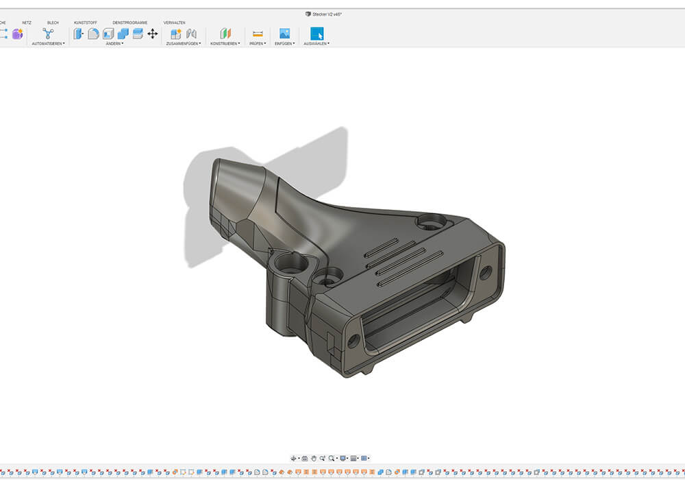 Eine der Kundenanfragen, die 3D-Werk mithilfe von Fusion 360 erfolgreich bedienen konnte, war für einen Verbindungsstecker zwischen Steuergerät im Auto und Auslesegerät. „Unsere Nachbarfirma ist an uns herangetreten mit einem Problem bei einem Stecker in ihren Auslesegeräten. Der Stecker, der an den OBD-Stecker im Auto angeschlossen wird und die Verbindung zum Auslesegerät darstellt, wurde bisher mit einem Hotmelt umspritzt. Dabei schmolzen teilweise die Litzen im Stecker an, was zu einem Kurzschluss führte.