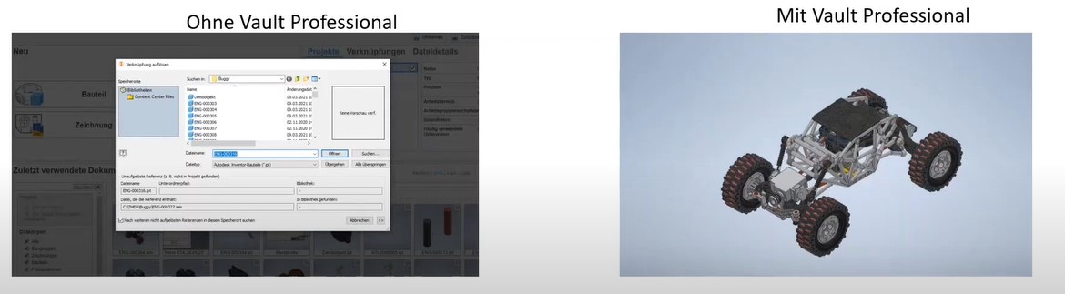 Da wir stetig unsere Daten Qualität verbessern möchten, ist Vault ein Programm, das uns auch dabei unterstützt. Auf Windowsebene ist dies hingegen wieder schwierig. Hier haben sie Ordner und Ihre Baugruppen. Die Gefahr besteht jedoch, wenn sie eine Baugruppe umbenennen, verschieben etc. geht die definierte Baugruppe dabei kaputt und sie kann sich nicht mehr öffnen. Diese Fehlermeldung Links erschient: Teil wird gesucht und nicht gefunden. In Vault hingegen passiert Ihnen so etwas nicht. Wenn sie im Programm eine Baugruppe in einen anderen Ordner verschieben würden, passiert dieser Datei nichts und bleibt komplett erhalten. Auf Windows Ebene würde dies so nicht funktionieren.