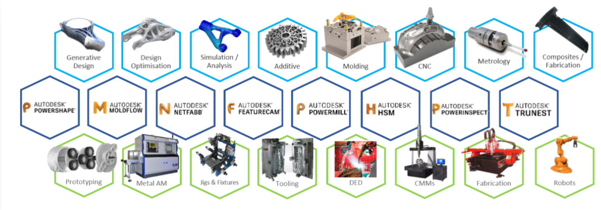 - Design: In diesem Bereich muss die Lösung entwickelt werden und hier steigen auch die Kosten. Zum Glück gibt es eine Reihe von Tools in der Fusion-Familie, die diesen Prozess vereinfachen. Dazu gehören Fusion 360, Inventor, SPI - Sheet Metal, PowerMill - CAM, PowerMill - Robot und Machining Extension.