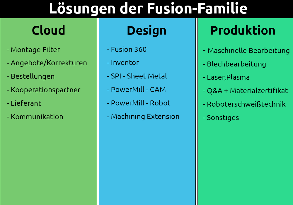 Die Fusion-Familie ist eine Produktreihe, die alle Prozesse von den ersten Skizzen bis zur endgültigen Fertigung unterstützt. Der Ablauf kann in drei Bereiche unterteilt werden: Cloud, Design und Produktion: