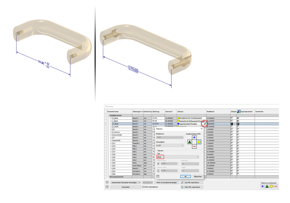 Außerdem wurde ein ganz neuer Toleranztyp „BASIS“ hinzugefügt. Sie können jetzt in eine Zeile der Parameterliste klicken und die Toleranzeinstellung vollständige öffnen. So können Sie schnell eine Basistoleranz auf 3D-Anmerkungen übertragen, synchronisieren und sie in Zeichnungen wiederherstellen – keine doppelte Arbeit oder Fehler auf der Zeichnung mehr!