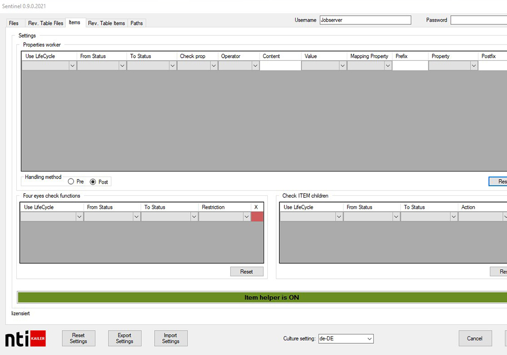 Zudem kann eine zusätzliche 4-Augen Prüfungen für Freigabeprozesse definiert und kundenspezifische Revisionstabellen in Dateien und Artikeln realisiert werden. Bei Artikeln ist es möglich, bestimmte Pfade mit variablen Dateinamen zusammenzusetzen und in entsprechende Eigenschaften zu schreiben, z.B. für die Zusammenarbeit mit Zusatzprodukten wie NTI FOR VAULT.