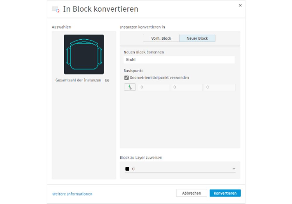 BSUCHEN, früher bekannt als BKONVERT, findet alle Instanzen derselben Geometrie in einer Zeichnung und ermöglicht so eine effiziente Blockkonvertierung.
