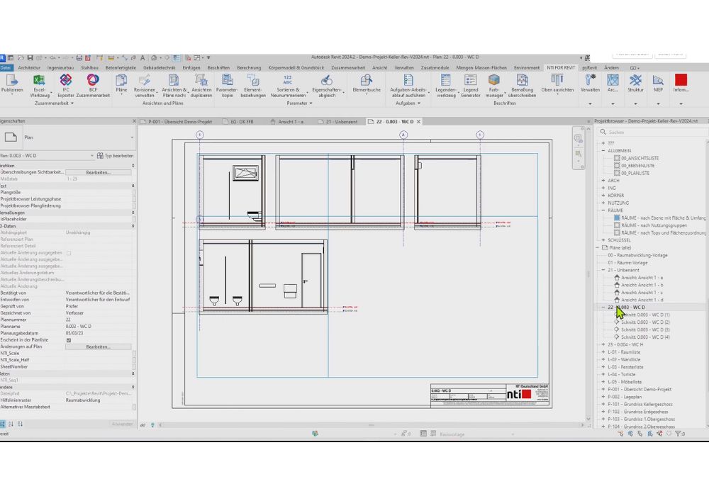 Die Funktion „Raumseitansichten“ des Autodesk Revit Plugins NTI FOR REVIT beschleunigt dieser Prozess erheblich. Das Tool bietet eine automatisierte Möglichkeit, Wandabwicklungen für mehrere Räume gleichzeitig zu erzeugen und direkt auf Plänen abzulegen.