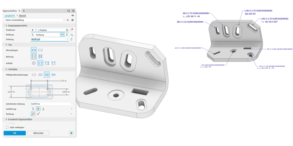 Das hat den riesigen Vorteil, dass Langlöcher mit den altbekannten 2D-Funktionalitäten für Bohrungen ausgestattet werden können. Erkennung für die Bohrtabelle, Bohrungs-Gewindeinfo, automatische Mittellinien – alles wird nun auf für die Langlöcher unterstützt.