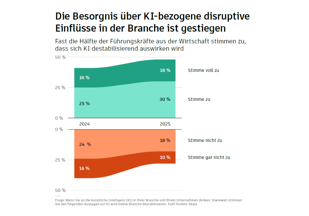 Fast die Hälfte (48 %) der Führungskräfte und Experten glaubt, dass KI ihre Branche destabilisieren wird. Im Jahr 2024 waren es nur 41 %. Dies deutet darauf hin, dass Führungskräfte zunehmend besorgt über KI und neue Technologien sind, da deren Einsatz in ihren Branchen und Organisationen zunimmt.