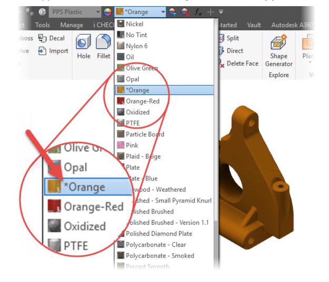 - Stjernen, som du kan se i dropdownlisten i funktionen ”Appearance” indikerer, at modelfarven overskriver materialefarven