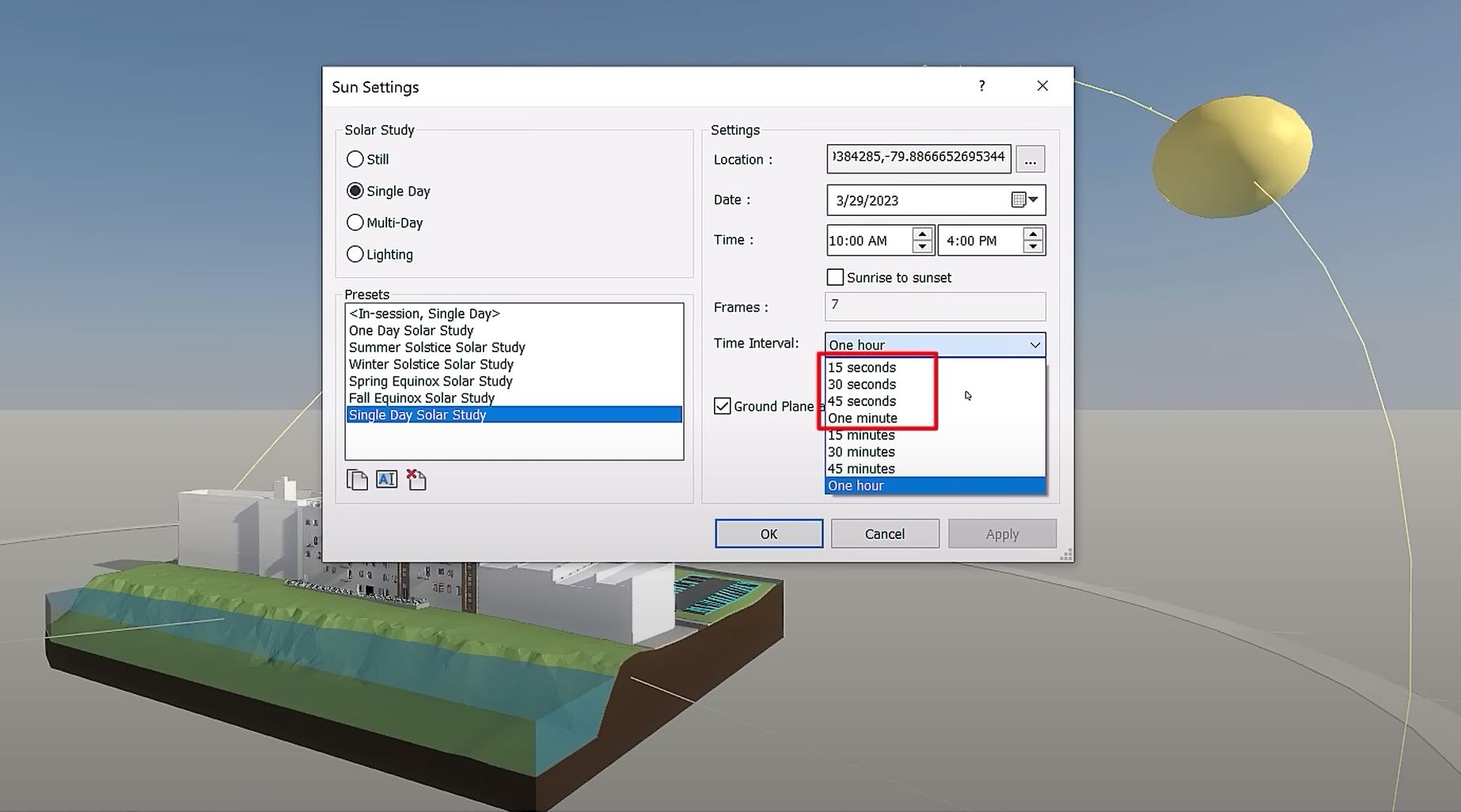 Du finder også nye forbedringer i fanen “Solar Study” i menuen, hvor du under funktionen “Sun Settings” nu har mulighed for at sætte kortere tidsintervaller, når du skal blive klogere på, hvordan solen påvirker dine designs. Helt konkret betyder det, at du i Revit 2024 kan lave skyggesimuleringer med en højere præcision ved at bruge 15-, 30-, 45- eller 60-sekunders intervaller.