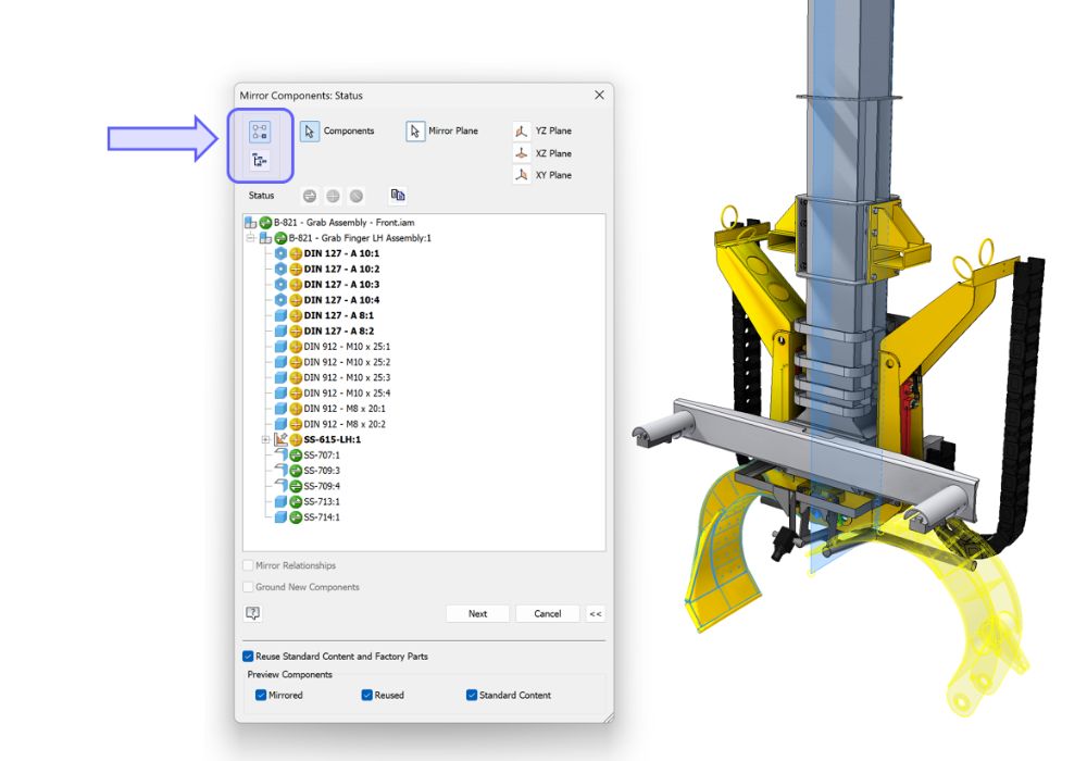 Mirror-funktionen i Assembly er blevet væsentligt forbedret. Ud over det klassiske spejlbillede kan du nu benytte den nye funktion Create Mirror Pattern, som gør det muligt at oprette et spejlet mønster med gentagelser. Det giver større fleksibilitet og effektivitet, når du arbejder med symmetriske konstruktioner.