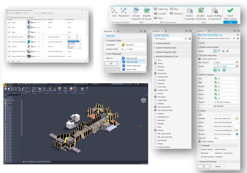 Derudover introduceres den nye funktion Simplify and Export, som gør det muligt at eksportere direkte til Revit (.RVT)-filer. Det skaber en langt hurtigere og mere effektiv arbejdsgang, når der arbejdes tværfagligt mellem Inventor og Revit.