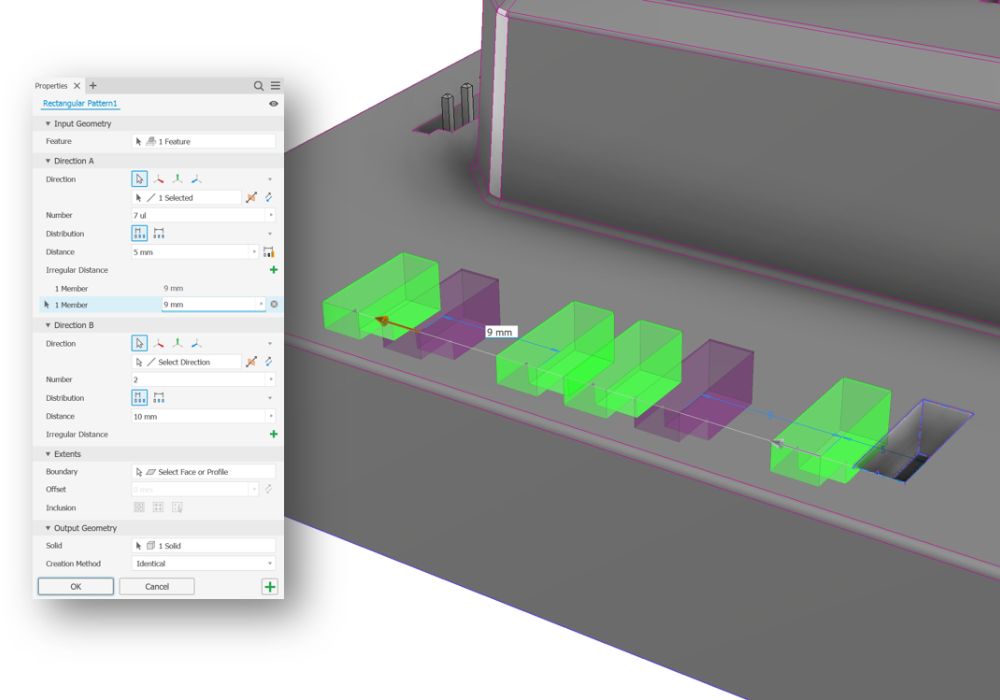 Pattern-værktøjet er blevet markant forbedret og giver dig nu mulighed for at oprette rektangulære og cirkulære mønstre med uregelmæssig placering. Du kan variere afstande, vinkler og retninger for de enkelte instanser i mønsteret – uden at være begrænset til ensartede rækker eller cirkler. Det giver langt større fleksibilitet ved komplekse designs, hvor præcis tilpasning er nødvendig.