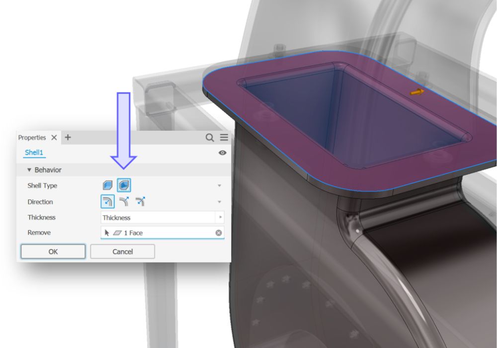 Shell-funktionen har fået en opdateret brugergrænseflade samt en ny mulighed: Du kan nu afrunde skarpe kanter direkte, mens du opretter et shell – hvilket sparer tid og minimerer efterfølgende redigering.