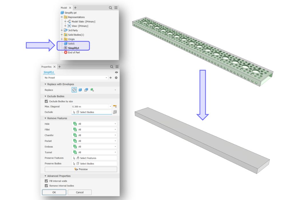 Det populære Simplification Tool, som tidligere kun var tilgængeligt i Assembly-miljøet, kan nu også anvendes i Parts-miljøet. Det gør det nemt at forenkle individuelle Solid Bodies.
