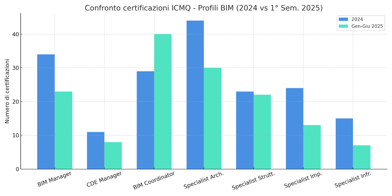 Dal confronto tra i dati ICMQ del 2024 e quelli aggiornati a giugno 2025 emerge un aumento significativo delle certificazioni per diversi profili BIM: