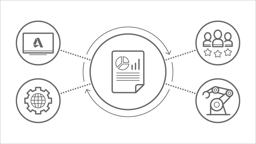 Sentraliserte produktdata er tilgjengelige innen og utenfor prosjektering, noe som eliminerer flaskehalser og forbedrer produktets livssyklusprosesser. Du kan administrere alle filtyper og all informasjon relatert til et produkt med PDM, inkludert dokumenter, regneark, bilder, PDF-er, CAD-data og tilhørende metadata.