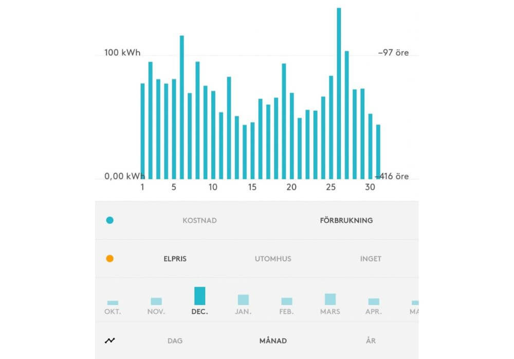 Bilden ovan visar elförbrukningen per dag under december 2021 för en genomsnittlig villa med en årsförbrukning på 17 000kWh. Förbrukningen var i snitt 65 - 70kWh per dag och hela månaden kostade ca 5 000 kr. Med den prisutveckling vi ser på elmarknaden idag kan det genomsnittliga kWh-priset mycket väl landa på 10 kr/kWh, om inte högre. Detta skulle innebära ca 20 000 kr i elräkning för samma period år 2022.