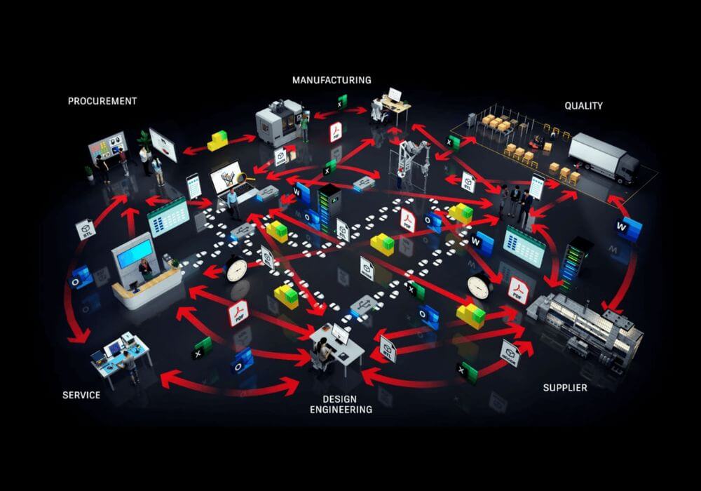 Exempel på hur dataflödet kan se ut inom ett tillverkande företag. Data kommuniceras i ett antal olika filformat där det krävs manuell inmatning i nästa system för att informationen ska leva vidare. Undersökningar från Autodesk visar att upp till 80% av konstruktörens tid går åt till administration av data, vilken kan sänkas avsevärt med en systemintegration.